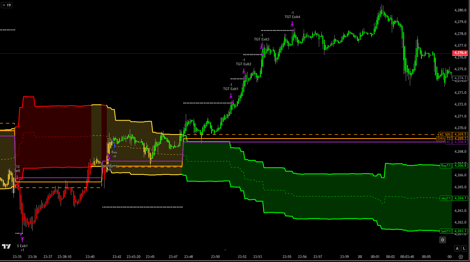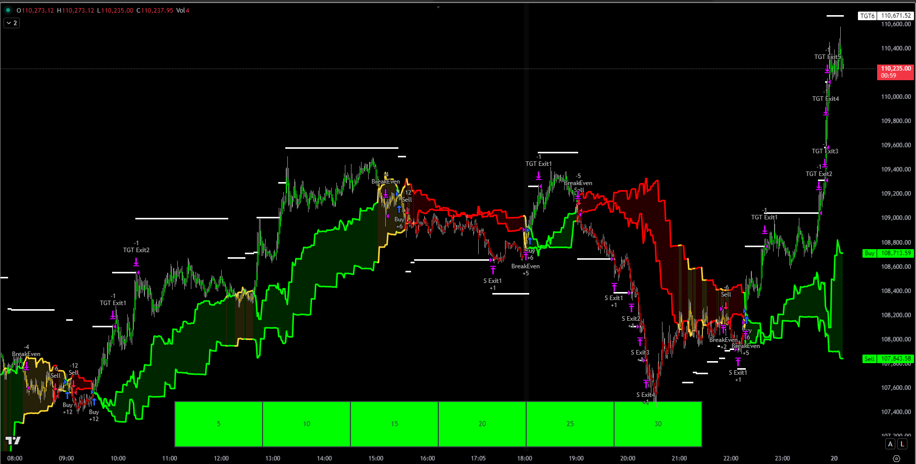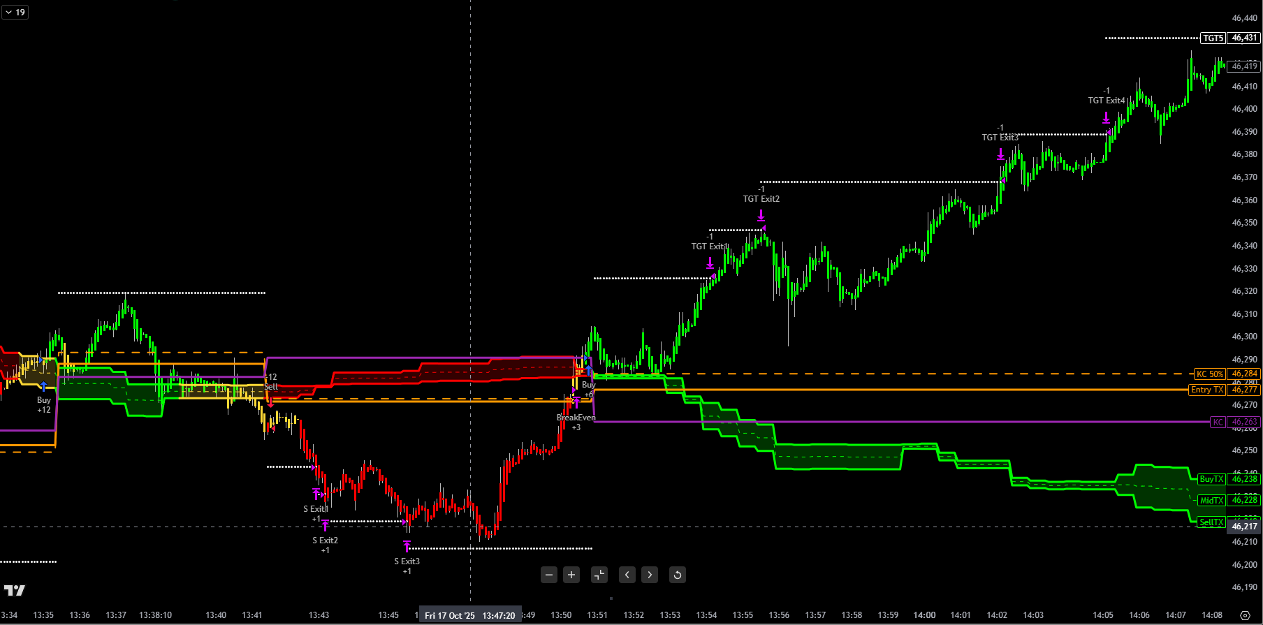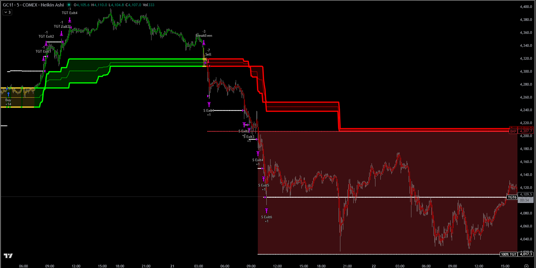 Automatic 6-target scaling system with dynamic stop loss placement, breakeven protection, and drawdown-triggered exits based on market structure.