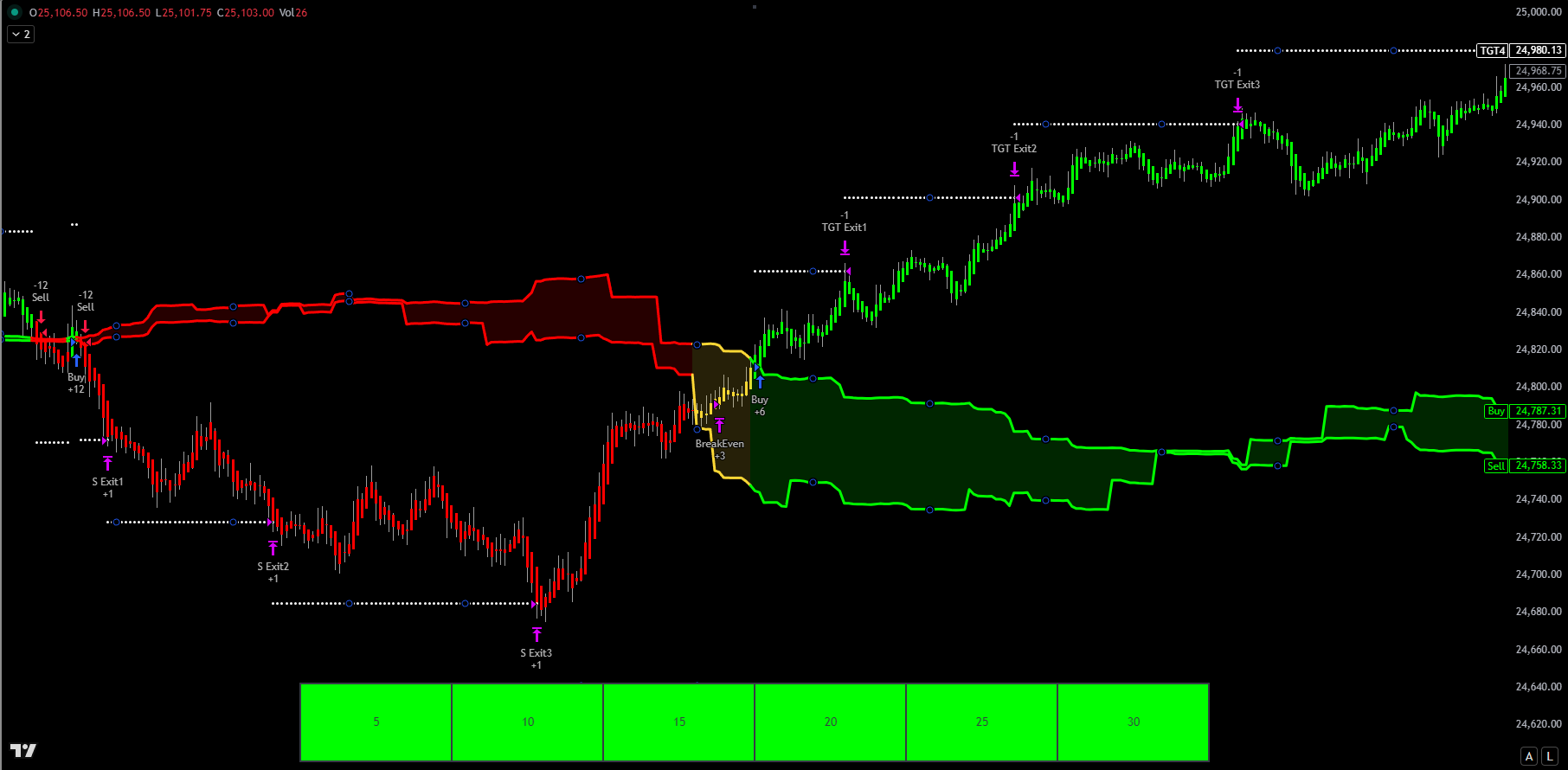 Monitors multiple timeframes simultaneously and consolidates signals into clear Buy/Sell zones.